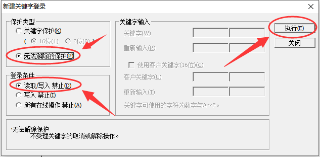 将PLC开关打到STOP状态,然后在“GX Works2”软件中,选择“在线”菜单=>“口令/关键字”=>“登录/更改”菜单项。在弹出的对话框中,选择“无法解密的保护”以及“读取/写入禁止”项,点击“执行”按钮即可完成加密。