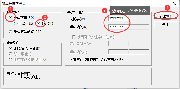 将PLC开关打到STOP状态,然后在“GX Works2”软件中,选择“在线”菜单=>“口令/关键字”=>“登录/更改”菜单项。在弹出的对话框中,选择“关键字保护”、“8位”以及“读取/写入禁止”项后,在关键字区域输入“12345678”,最后点击“执行”按钮即可。