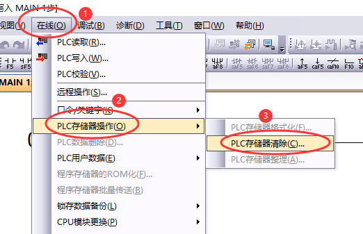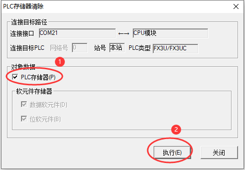 将PLC开关打到STOP状态,然后在“GX Works2”软件中,选择“在线”菜单=>“PLC存储器操作”=>“PLC存储器清除”菜单项。在弹出的对话框中,勾选“PLC存储器”项后,点击“执行”按钮即可。